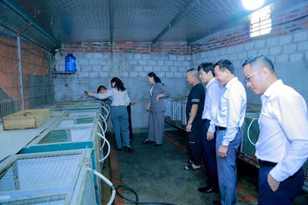 Các đồng chí lãnh đạo Hội Nông dân tỉnh và lãnh đạo phường Đông Triều thăm mô hình nuôi cầy hương tại khu phố Nguyễn Huệ 3, phường Đông Triều